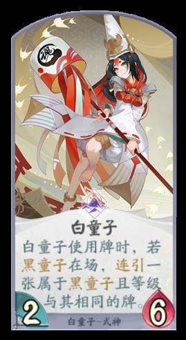 白童子是一位偏向于站场防守的紫岩派系式神。当白童子使用卡牌时,可以「连引」一张与黑童子等级相同的黑童子专属卡牌。白童子和黑童子通过「连引」相互辅助时,可以发挥出更好的效果。