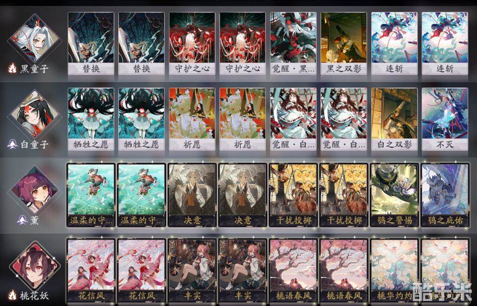 1.这是一套由白童子、黑童子、薰、桃花妖组成的大妖卡组。由于黑童子与白童子的二勾玉形态牌较为出众,所以养成大妖的卡组构筑思路也是可以进行尝试的。