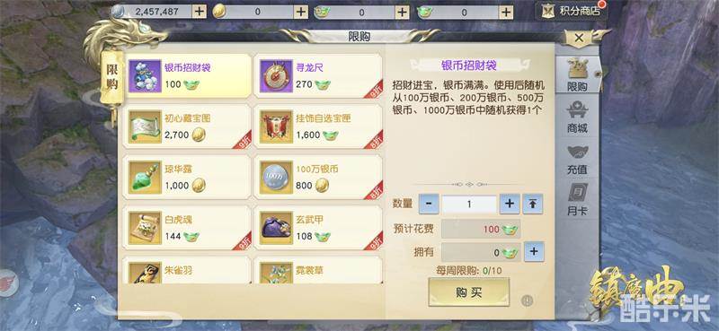 《镇魔曲》初心服里,天命者们可以发现商城内出售的道具大幅减少,仅有银币、藏宝图等少数日常用品,其他装备、宝石、灵兽等全部交给玩家进行交易,其价值也由市场决定。