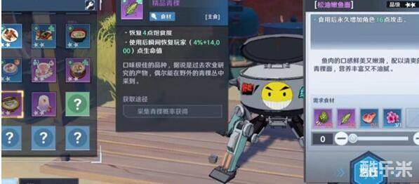 1、幻塔松油嫩鱼面需要玩家准备5个嫩松籽、5个精品青稞、1个鲜嫩精肉和1个小叶杜鹃,这些食材都有固定的获取地点: