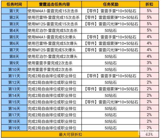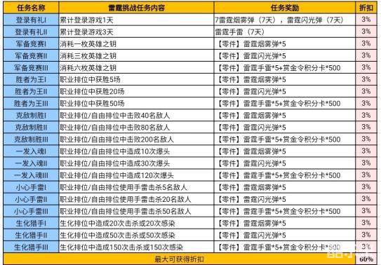 活动任务分为雷霆挑战任务和雷霆追击任务,完成雷霆挑战任务,不仅可以获得丰厚奖励,同时还能获得雷霆系列武器(COP 357-雷霆除外)的折扣。大家可以同时完成多项挑战任务,任务内容和对应的奖励都在下图中。全部完成后,购买雷霆系列武器(COP 357-雷霆除外)时可享受60%的钜惠折扣。