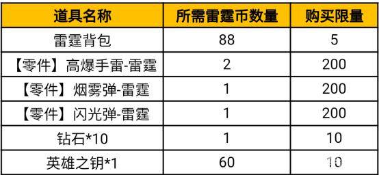 那么问题来了,如果落下了某个任务,导致雷霆投掷套装碎片不够怎么办?别担心,活动中还设有兑换箱,内含雷霆投掷套装碎片、雷霆背包等道具,消耗雷霆币即可兑换。各项道具的兑换价格和限购次数都在下图中,请大家自行参考。