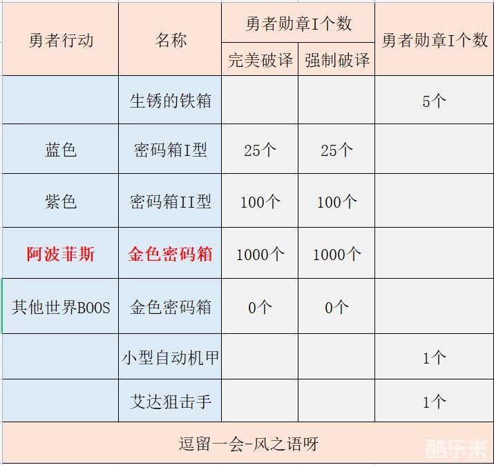 总结:目前推荐击败世界BOOS-阿波菲斯【俗称:狗】,快速获取勇者勋章I,没有金色密码芯片也别怕,楼主亲测,强制破解一样是1000枚,而竞速活动,在闲暇时候也可以体验一下。