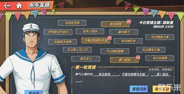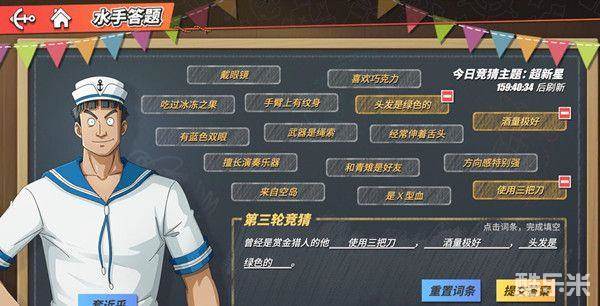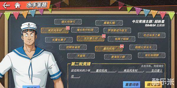 -选择词条补全残缺的句子,猜出水手心中想的海上伙伴,如果一时没有头绪,还可以赠送水手甜食获得额外提示~(水手喜欢的甜食可以在活跃人物奖励宝箱中获得)