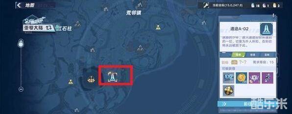 1、我们要想获取的话是需要先去找到这个遗迹A-02,就是会出现在南部环山旁边的哦,要想快速去的话是需要先去折跃门传送到南部环山然后去遗迹的话就会方便简单很多了呢。