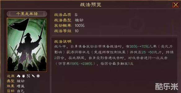 千里走单骑,被动战法,在自带准备战法进入准备发动状态时,有概率让自身获得洞察状态和提高大量武力,充分保证了自带准备战法的释放成功率,在洞察持续期间,还可每回合进行一次反击,进一步提升让自身的伤害能力。