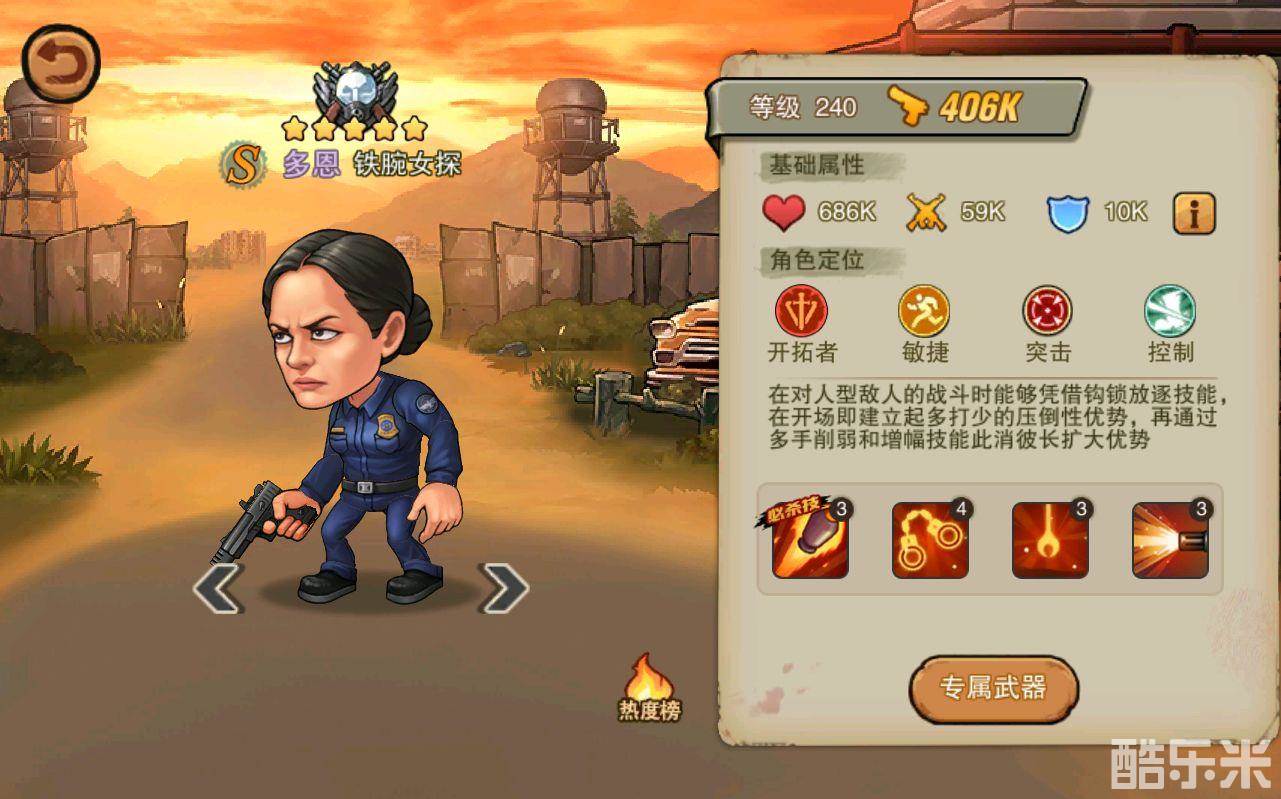 因此多恩并不适合输出位,可作为辅助或是增益类放置后排,为团体带来收益,在面对一些带有控制,或是减防的丧尸时,可以考虑带上多恩。