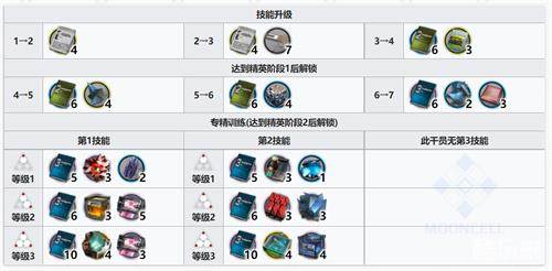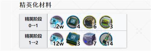 精英阶段1→2 龙门币*12万、辅助双芯片*3、三水锰矿*7、晶体元件*14