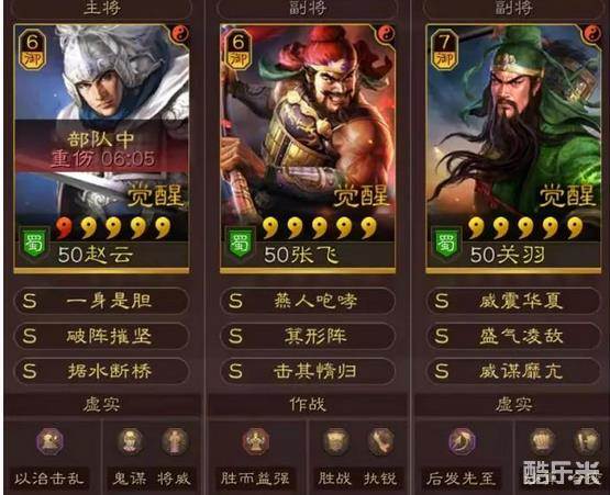 赵云张飞全武力,关羽可以选择加点速度,打魏法因为兵种克制,所以会很伤,但是不会输,不能碰的只有藤甲,不怕麒麟弓,不怕五虎枪,打吴枪看脸,没碰过香香骑,如果香香主将,有箕形阵、有盛气也是不虚。