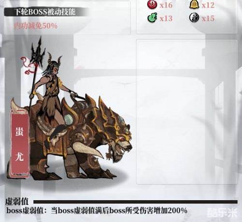 1、宗门狩猎,首先敌人是一个单体怪物,进入战斗可以查看boss的被动技能,会有内功减免或外功减免的状态,可以根据前提进行安排决策;输出越高越快打出boss的虚弱状态。