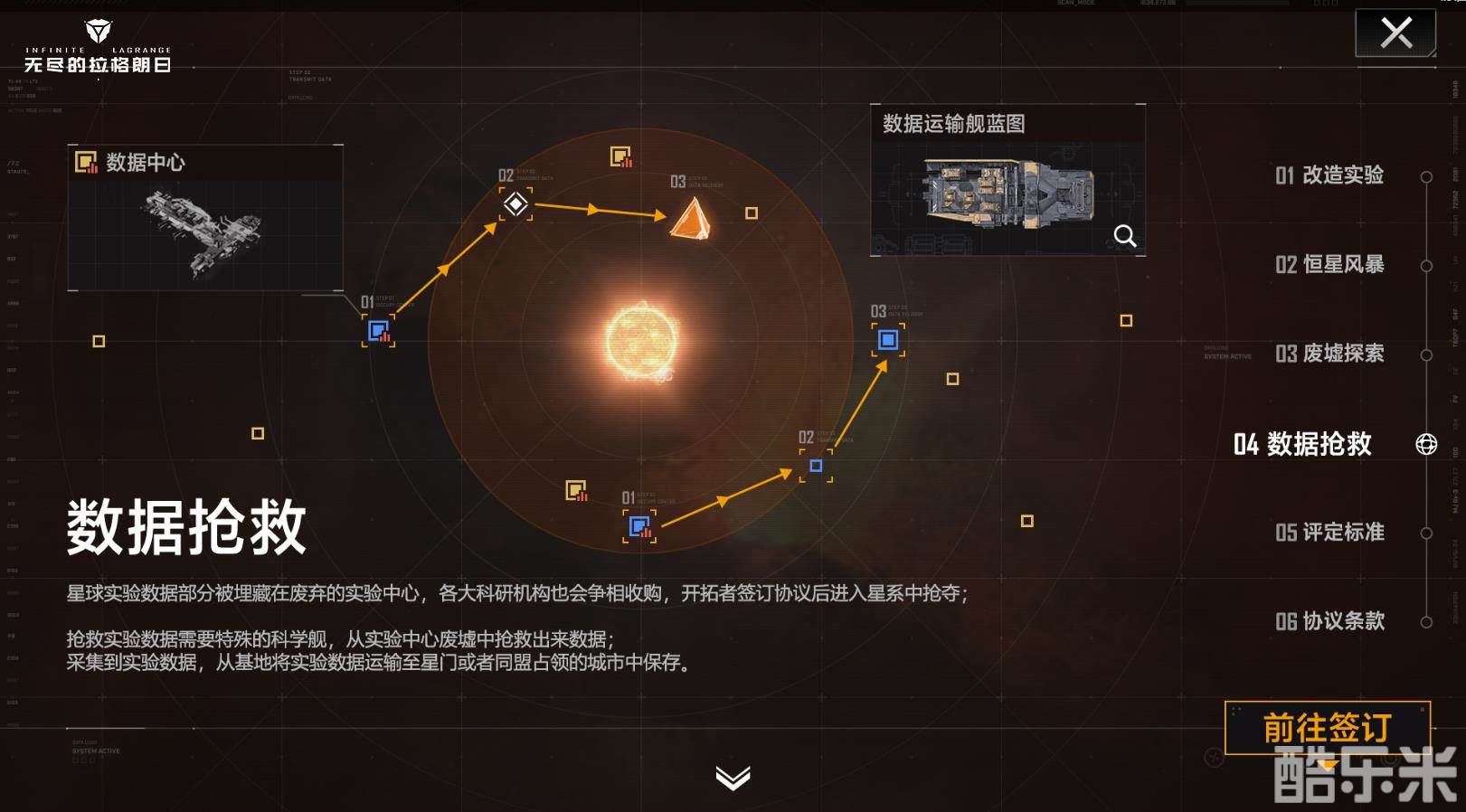 星球实验数据部分被埋藏在废弃的实验中心,各大科研机构也会争相收购,因此开拓者签订协议后,需要派遣该协议所提供的临时舰船前往建筑收集实验数据,并将这些数据运往星门或同盟占领的城市中进行保存。最终星系评定会根据各联盟的实验数据收集数量多少进行评定。
