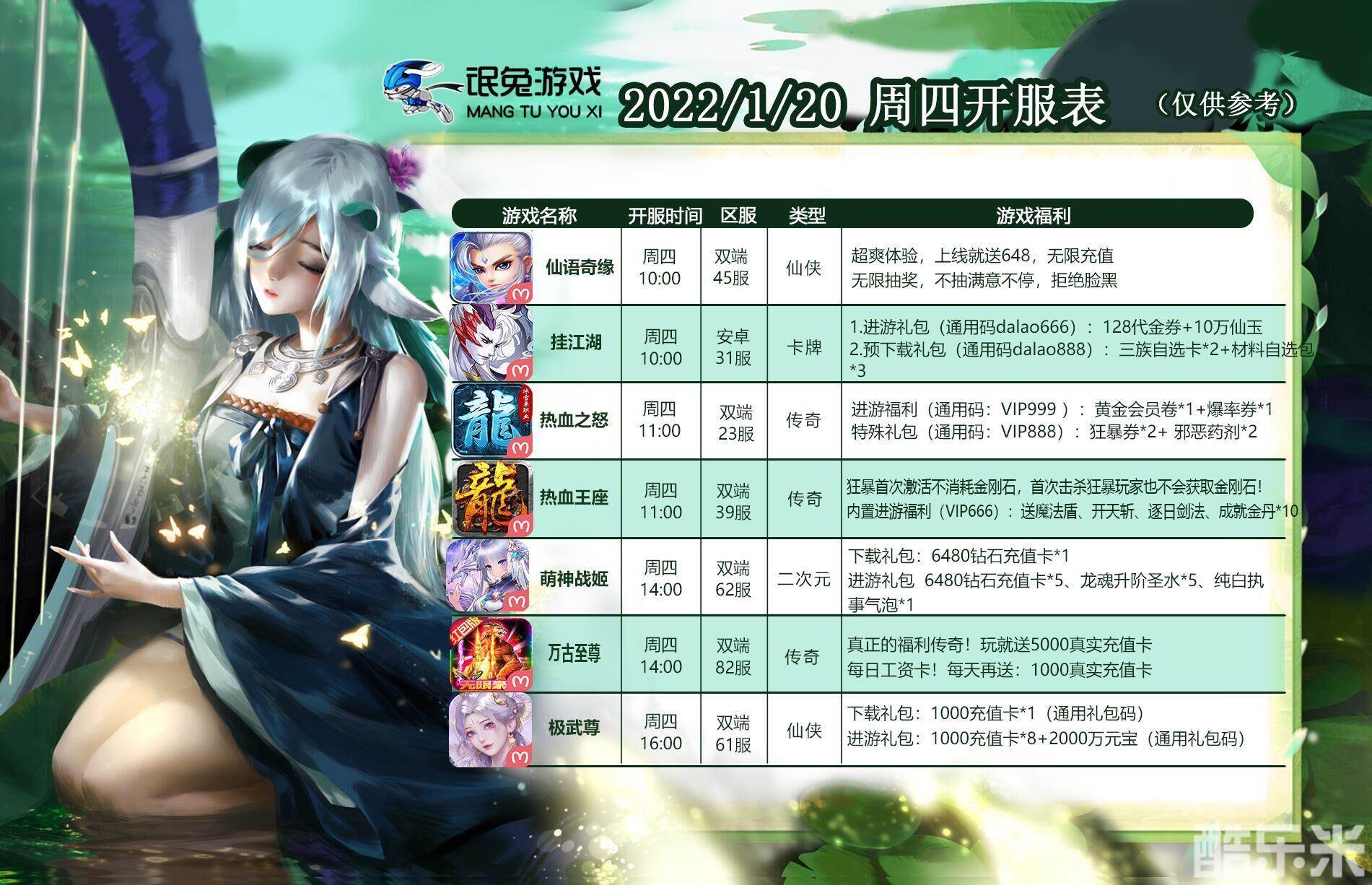 | 仙语奇缘-无限抽 | 天下45区( 苹果- 安卓) | 2022-01-20 10:00:00 |