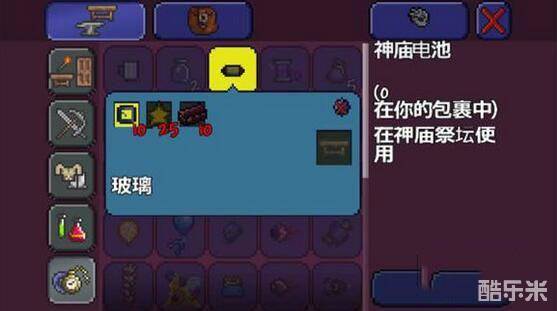 神庙电池合成则需要:25个落星+10个精金锭+10个玻璃,在工作台上合成。