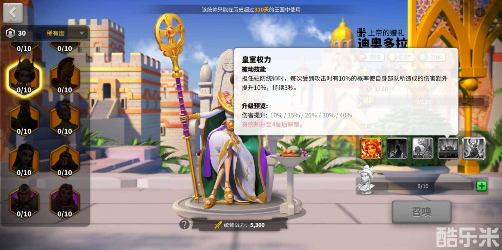 第二个技能叫做皇室权力,玩家们如果被攻击了,能够提升部队伤害哦,搭配其他的技能可以打出一波不错的爆发伤害,而且可以无视缴械效果和普攻封印,只要我们有机会就能输出,完全不会造成影响。