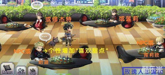 ②哈迪个性+1:玫瑰人生右边出去到露台,可随机遇到修杰特、莲莉、库利欧、哈迪、其他NPC,和哈迪对话可为其增加个性“喜欢甜点”(出现条件:有抽到哈迪,且完成不凋花外传)