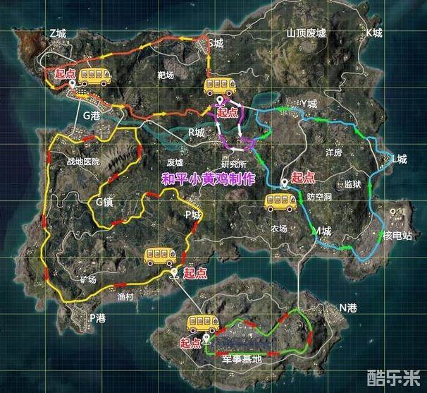 1、图中就是小编为玩家们分享的小鸡车行驶路线图了,一般在开局的时候小鸡车就已经开始刷新了,刷新之后就会按照固定的路线来走,玩家们可以根据小鸡车的行驶路线图来寻找,这样会更加的快速。