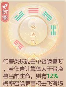 一合五气:伤害类技能击中敌方召唤兽时,伤害值大于被击中召唤兽当前生命值,有概率直接击飞离场。非常强大的输出阵法,对涅槃