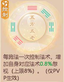 奇门五转:每回合结束时,削减被控制敌人的伤害抵抗,并且提升自身对应法术的忽视。此阵法,只推荐睡人和忘鬼使用,因为不但和五蕴皆空一样有三个稀有阵位,而且只有控制成功才会激活降低敌人伤害低抗和增加自身忽视的效果,并且伤害抵抗只能降为0,不能为负,对于本身没有伤害抵抗的敌人来说,是完全没有意义的,不建议普通玩家使用。多为控制人族使用,