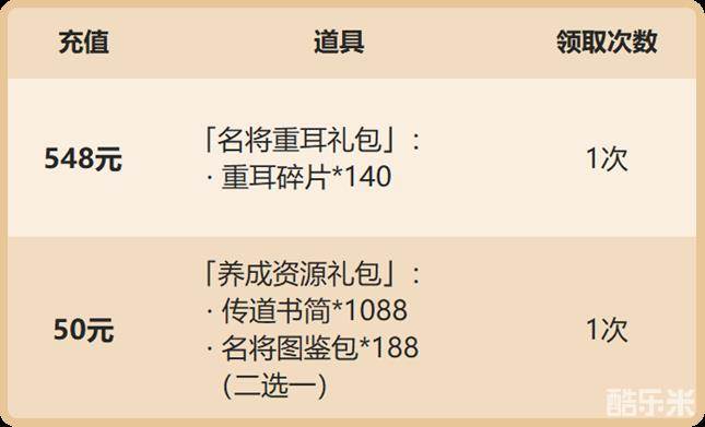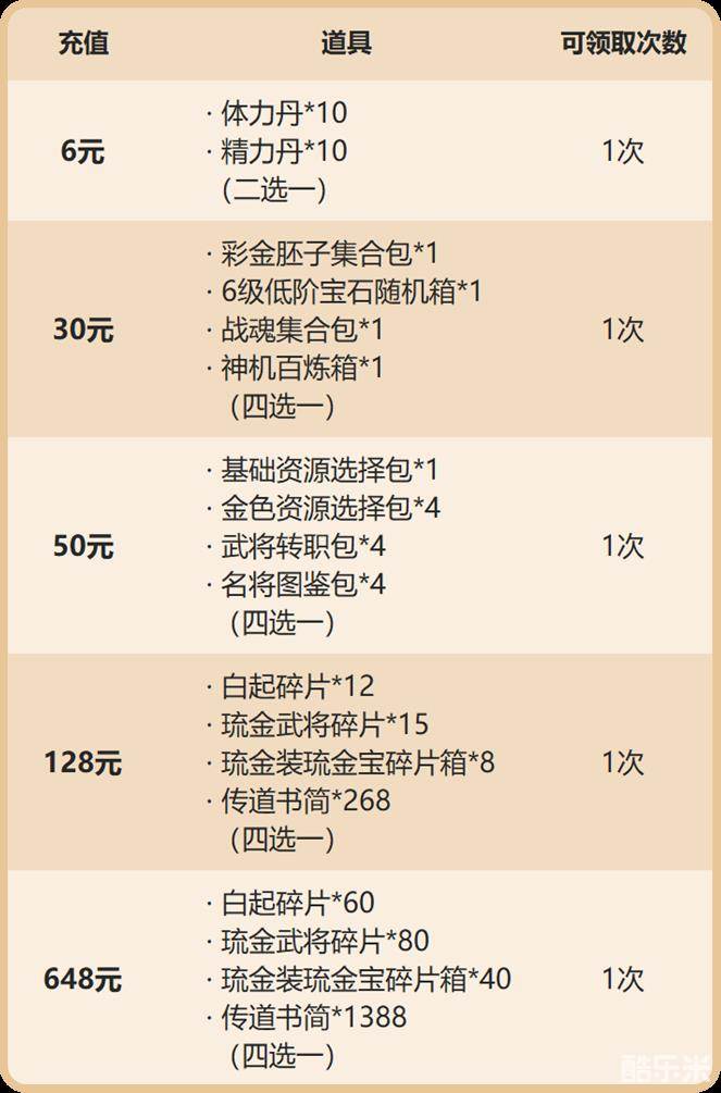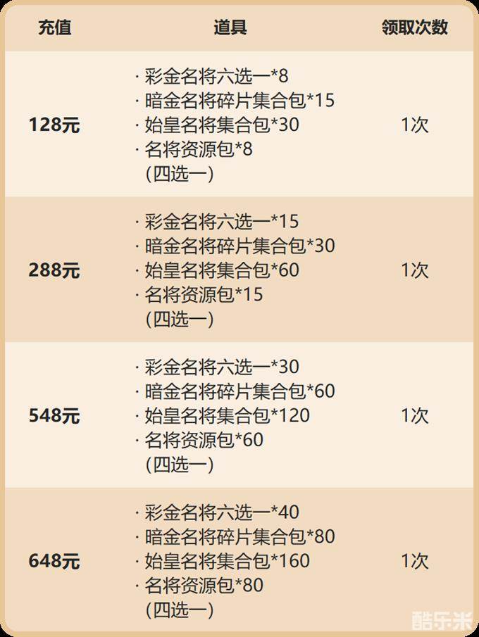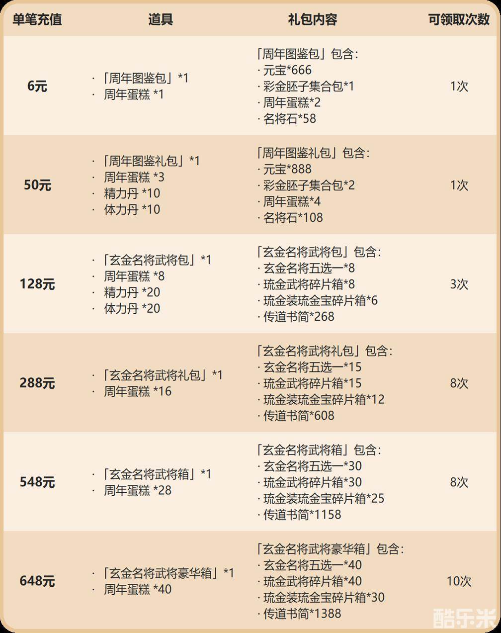 在活动期间少年们单笔充值至指定金额,即可获得玄金名将五选一、琉金武将碎片箱、琉金装琉金宝碎片箱、传道书简、周年蛋糕等资源: