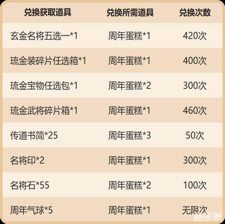 「周年蛋糕」可用来兑换玄金名将五选一、琉金武将碎片箱等稀有资源: