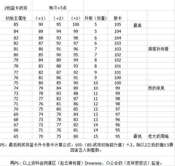 1档蓝卡武将可以用各种将灵去培养到紫色,每次提升+1 +2 +3,主属性提升为固定的4点主属性,比如满武力75的公孙瓒,+1之后就是79,+2之后就是83,+3之后就是87,最后升紫卡的时候是加3点,最终得到的紫卡为90点武力值,成长是增加0.20,如果蓝卡为1.29,紫卡就为1.49,一次类推,所有的1档武将都是如此。