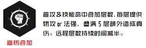 高热叠加:普攻、技能命中敌方英雄(跳一次伤害就算命中一次比如多段伤害的技能,多段伤害的普攻)会叠加攻击or法强,持续5秒(远程英雄持续时间减半),最多叠加5层,叠加5层之后额外造成10%的真实伤害。