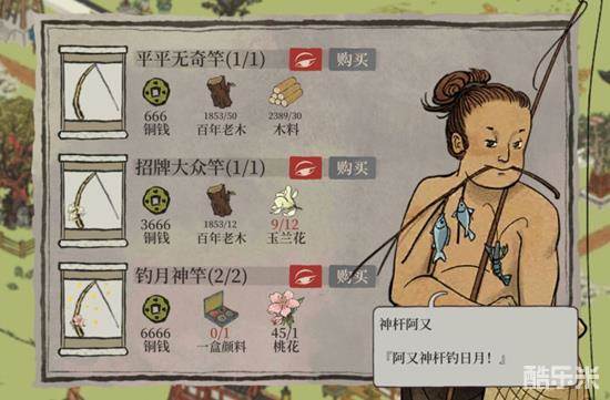 2、购买钓月神竿花费了6666铜钱,一盒颜料和1朵桃花。