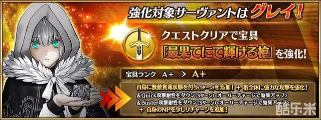 格蕾本次强化的也是宝具本,追加造成伤害前赋予自身无敌贯通状态1回合,宝具倍率提升至400%~600%,宝具后增加自身10%NP。