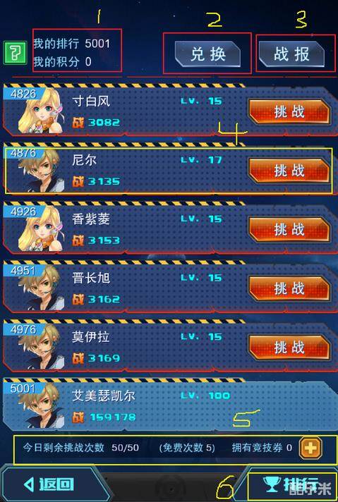 竞技场是游戏的特色系统之一,在竞技场中,玩家可以充分的享受到玩家间PK的快感,挑战胜利还能获得高额奖励和积分,同时竞技场会根据排行榜每天发放一定的奖励。点击“挑战”可以对所选玩家进行挑战,挑战胜利时,若原排名低于所挑战玩家,则排名与所挑战玩家交换,获得400积分,若原排名高于所挑战玩家,则仅获得400积分;挑战失败时,排名不变,仅获得200积分。
