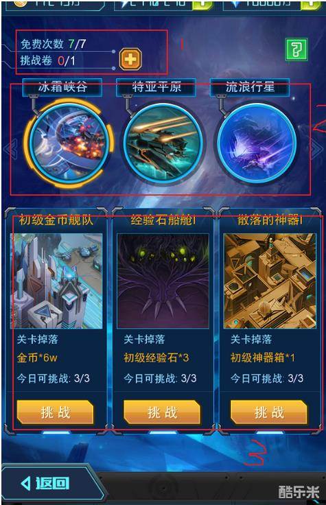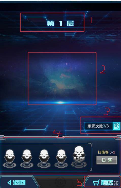 星际远征是游戏的特色系统之一,玩家从第一层开始,每层5个小关卡,最后一关为boss关,可以扫荡之前已通关的层数。可以获得资源和星币,星币可以在商店购买商品。点击屏幕2位置,可以进行探索,探索结果为宝箱或者怪物,点击宝箱则开启宝箱,点击怪物则进行战斗。每天可以重置一定次数。