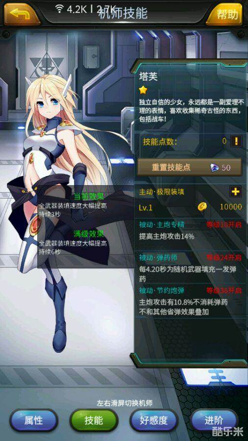 独立自信的少女,永远都是一副爱理不理的表情,喜欢收集稀奇古怪的东西,包括战车!塔芙唯一值得玩家们乐道的话题大概就是她身上层出不穷的bug了吧,抛开这些死活修不好的BUG,塔芙也只能在板凳上静静的待着了。