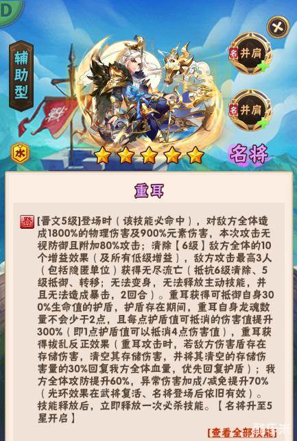 全新玄金名将重耳的技能可以提供庞大的增减益,从而为少年的阵容提供超强的辅助效果。另外重耳可以为我方提供灼烧抵御效果,大幅降低我方受到的灼烧伤害,大幅提升我方武将的存活能力。