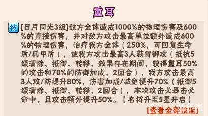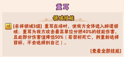 重耳在自身护盾/血量翻4倍的情况下具有非常肉的身板,此外还能为我方主力武将分担伤害,并降低受到的伤害,提升我方主力单位的存活能力。破盾技能为强大的保底技能,可以将核心技能机制再次触发,实现技能的二次利用。