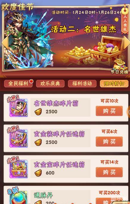 周年庆典折扣商店限时促销,折扣低至2折,用元宝就能购买大量稀缺资源!快来选购吧。