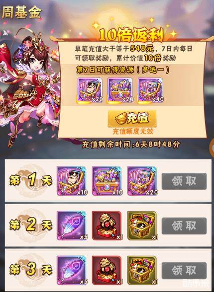 活动规则:在活动期间,7天内任意1天充值548及以上,都能立即激活周基金,领取当前天数所有奖励!7天内可获得如下奖励: