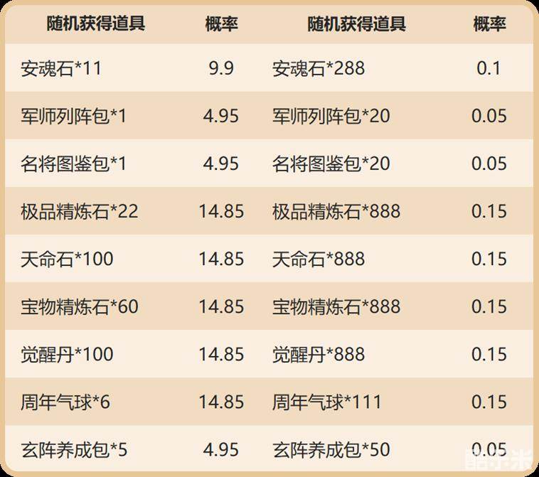 3.「庆典礼盒」可开出:周年气球*111、玄阵养成包*50、觉醒丹*888、天命石*888、极品精炼石*888、安魂石*666、军师列阵包*40、名将图鉴包*40、宝物精炼石*888、周年气球*6、玄阵养成包*5、觉醒丹*100、天命石*100、极品精炼石*22、安魂石*11、军师列阵包*1、名将图鉴包*1、宝物精炼石*60中的随机1种。