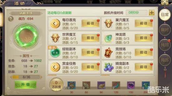 2.日常玩法,当你无任务可做的时候,可以选择去日常,那里有很多副本,比如神龙塔、骑宠副本,打完后可获得强化材料,可以提升大量的战力。