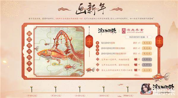 新春佳节即将到来,汴金城内欢笑之声不绝于耳,人们纷纷走上街头互道祝福。在活动期间内,阁下完成游戏中的每日任务即可在活动界面领取桃花坞木版年画碎片,阁下可将碎片合成随机拼图,完成整体拼图后还有大量活动好礼等待阁下前来领取哦,让你在新年伊始之时满载而归!