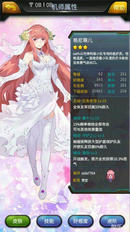 oath公司弗利兹小队专用的医护员,性格温柔,一直暗恋着小队里的贝卡斯但没有勇气说出口。暗恋主角的妹子,全图群奶,在推图时比较好用,而且成型容易,萌新必备。推荐机体女武神S。