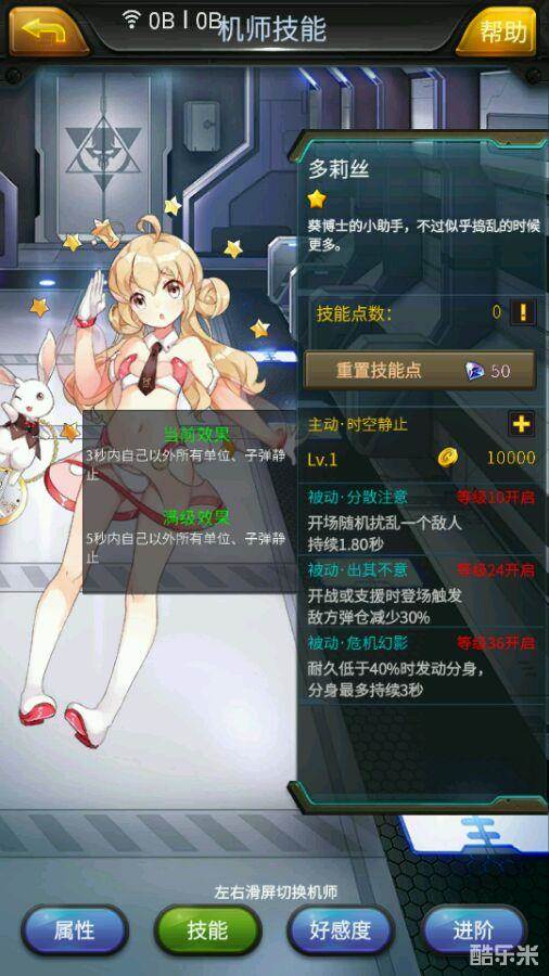 多莉丝是葵博士的小助手,不过似乎捣乱的时候更多。属性平庸,但技能相当出色,时停技能让人眼前一亮,被动技能效果也都相当不错。推荐机体飞影大师+炸雷,也可以考虑使用高攻击力的近战。