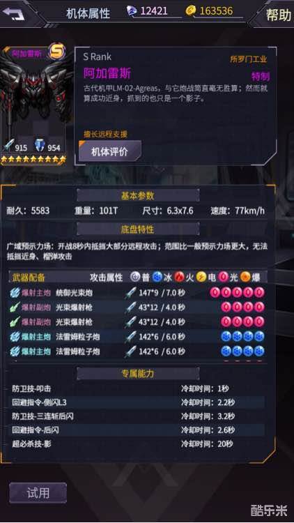 古代机甲LM-02-Agreas,与它炮战简直毫无胜算;然而就算成功近身,抓到的也只是一个影子。相比于拜蒙和贝利尔,阿加雷斯作为始终没有被淘汰的远程机出场率略高一筹,阿加雷斯的强度很高,然而架不住有比他更强的存在。不过阿加雷斯也算是比较容易获得的,在一线机体中还有一席之地。