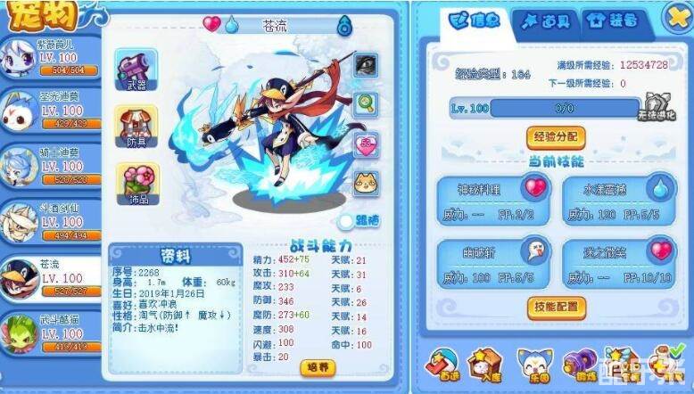 技能2:击水中流:汲取对方全阵10%生命依次分配给损失血量多的宠物,并吸取少许对方场上宠物双防值。