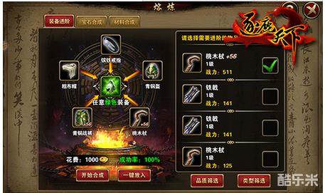 合成成功后,新装备继承材料装备中强化等级最高的强化等级,失败则返还玩家材料装备中的战斗力最高的一件装备(不计算宝石)。不管成功还是失败,所有被消耗掉的材料装备的强化等级都转化成铜币返还给玩家,已镶嵌宝石都自动拆除返还至背包。