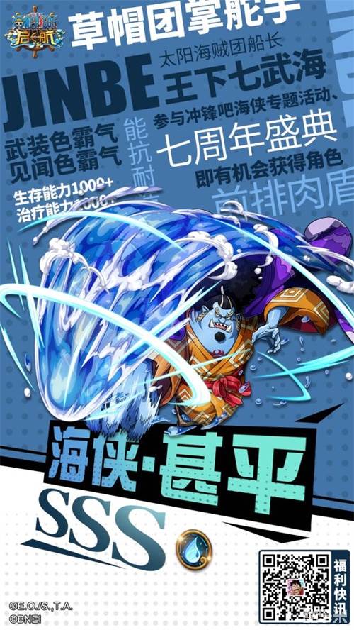 《航海王 启航》七周年庆典今日盛大开启,多重活动福利享不停,SSS 海侠·甚平今日也正式登场,趁着新年假期,快快叫上小伙伴一起玩游戏、拿福利吧!更多资讯可以登录《航海王 启航》官网或关注官方公众号查询。