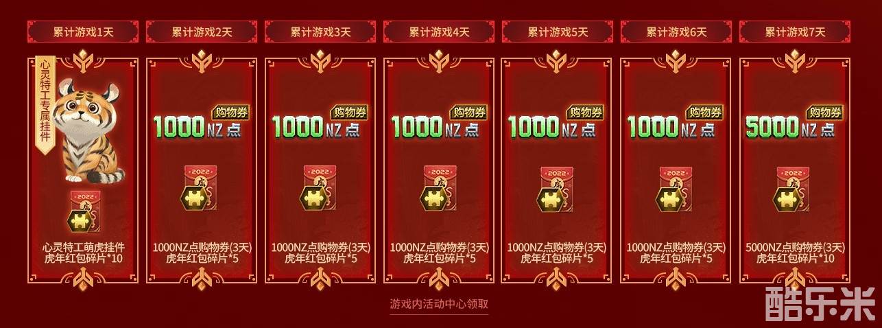 只要你在2月1日至2月10日内,累计游戏7天,还能直接领取5000NZ点购物券(3天)、虎年红包碎片(10)