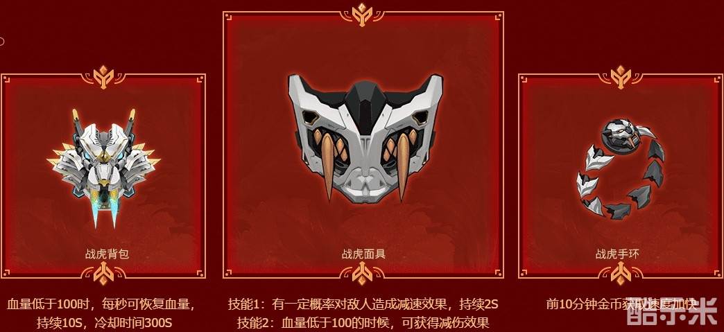 战虎背包:血量低于100时,加强回血效果,持续10S;冷却时间300S。