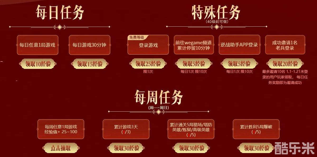 春节宝库每级经验值均为25,只要完成每日任务、特殊任务、每周任务,就能领取经验,升级宝库。若拥有萌萌虎-筱筱或虎爪萌枪任意一个道具,即可领取【每日任务】双倍经验buff,领取后将于次日零点生效,双倍加成将持续5天。