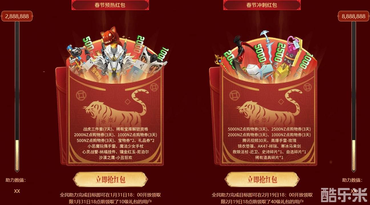 逆战全民聚福为各位NZer积攒福气,不仅有春季红包、购物券、限定虎年挂件,还有战虎三件套等你免费领取!