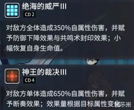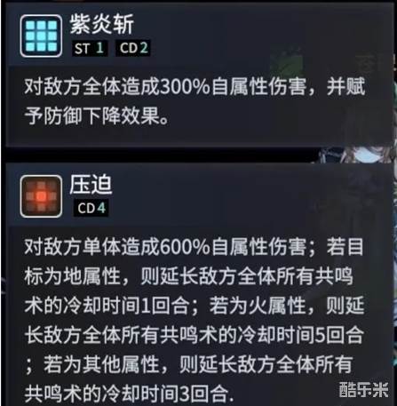 这个boss的一技能是群体aoe伤害,防御下降共鸣术封印(两回合),同时小幅提升生命值。技能二不可被延时,必定发动,单体高额伤害,同时调律获得量降低(跨属60%)。