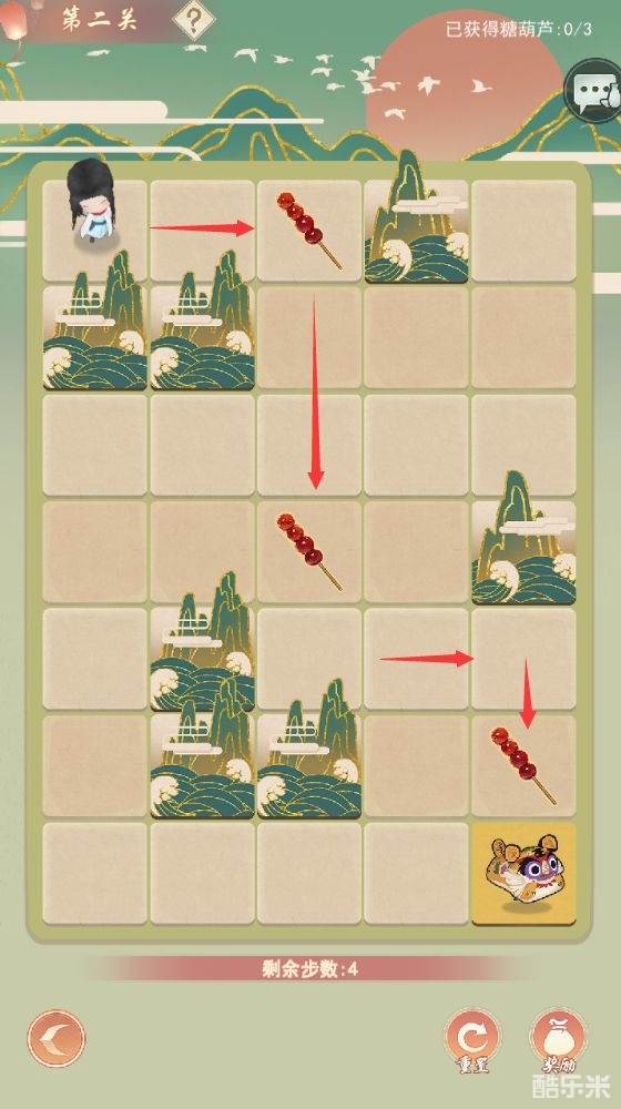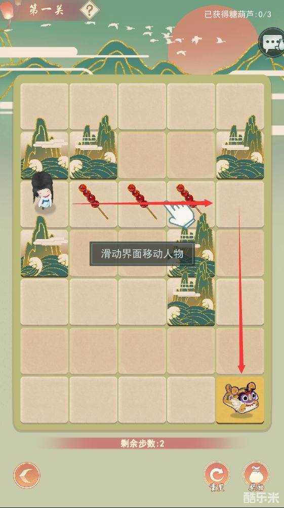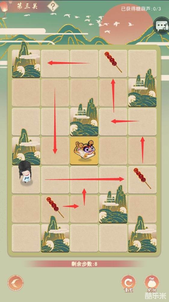 1.玩家需要在有限的步数内通过滑动角色先获得三个糖葫芦之后再站在小老虎地块即算过关(顺序不可逆)。